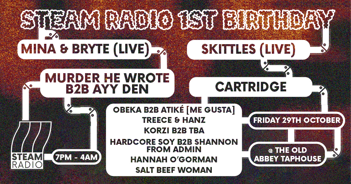 Celebrating a year of community building over the airwaves, Steam are bringing a spooky day and night party to their home, Manchester’s The Old Abbey Taphouse, on Friday 29th October. As well as afro-club pioneers Mina & Bryte, local legends Skittles, Murder He Wrote, Ayy Den and Cartidge will be showcasing their tastes to the floor, alongside a healthy helping of Steam reisdent DJs.